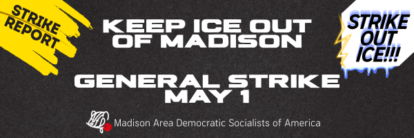 If you are able, donate to the Madison Area General Strike Fund. Funds will be managed by Madison Area DSA, and will be used to pay for things like room rental, printing, and other organizing resources to keep ICE out of Madison and support a General Strike. If any funds remain unused after May 1st, they may be rolled over into future strike funds or used for other activities in line with MADSA’s mission.